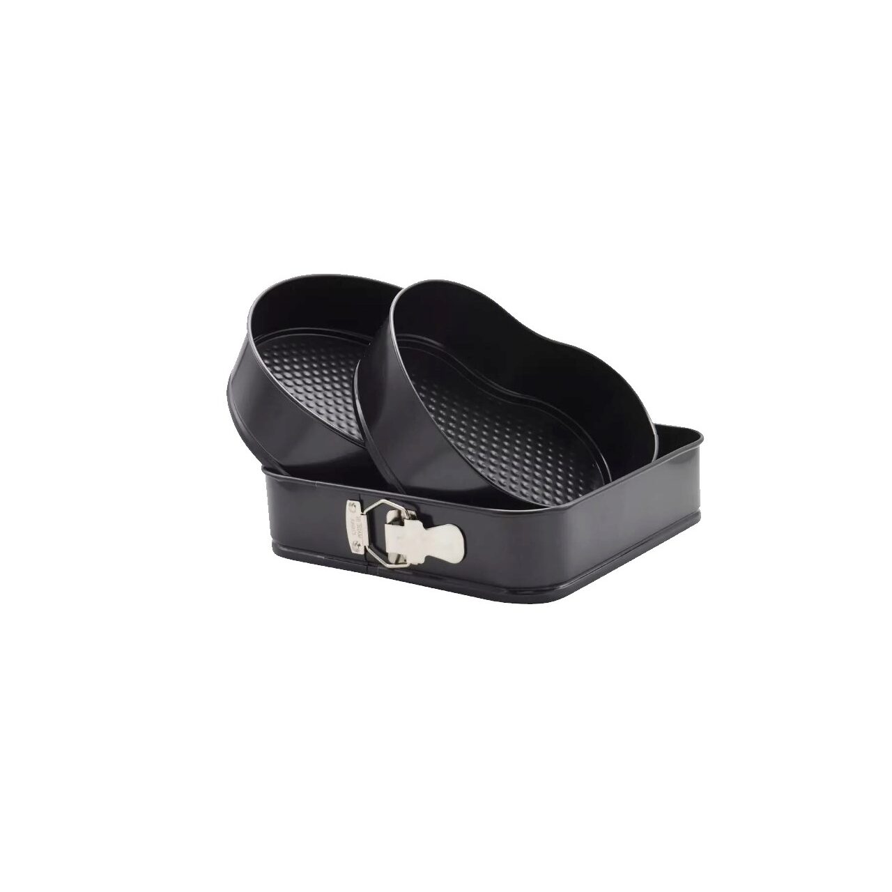 Un set de forme de tavă / forme de tort pentru coacerea a 3 elemente acoperite cu un strat antiaderent.
