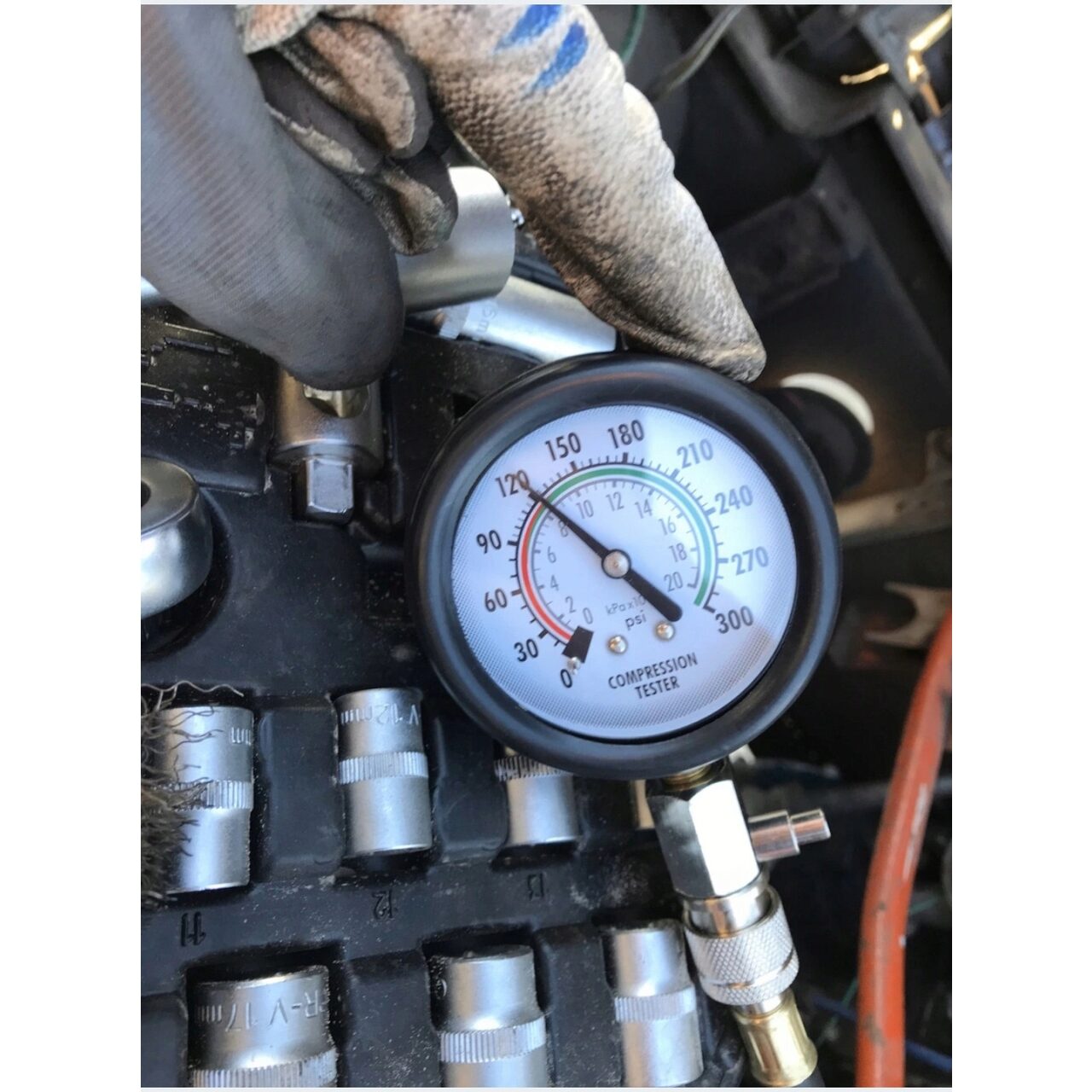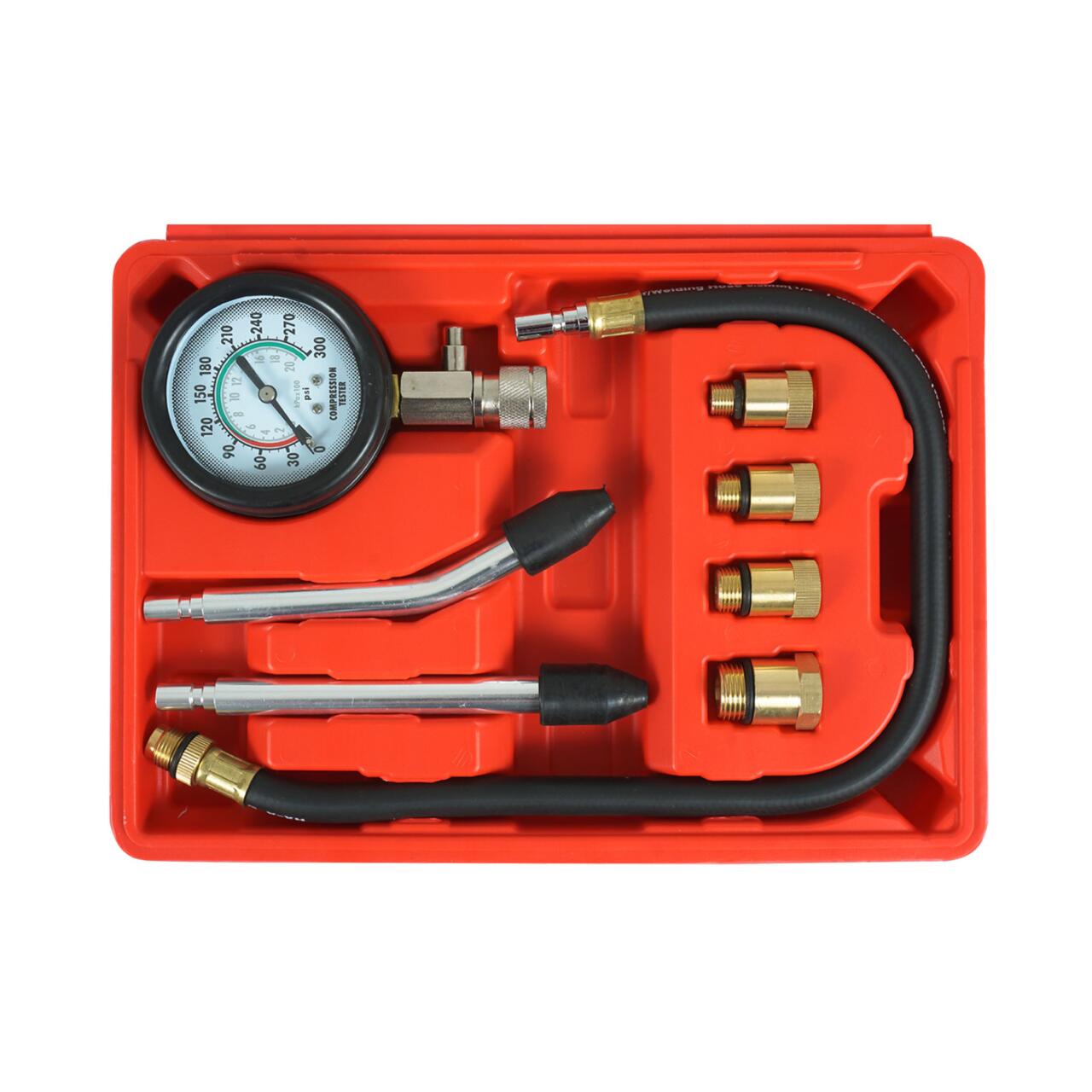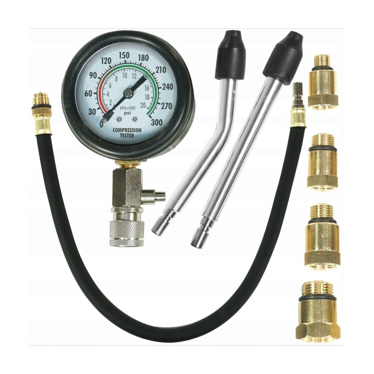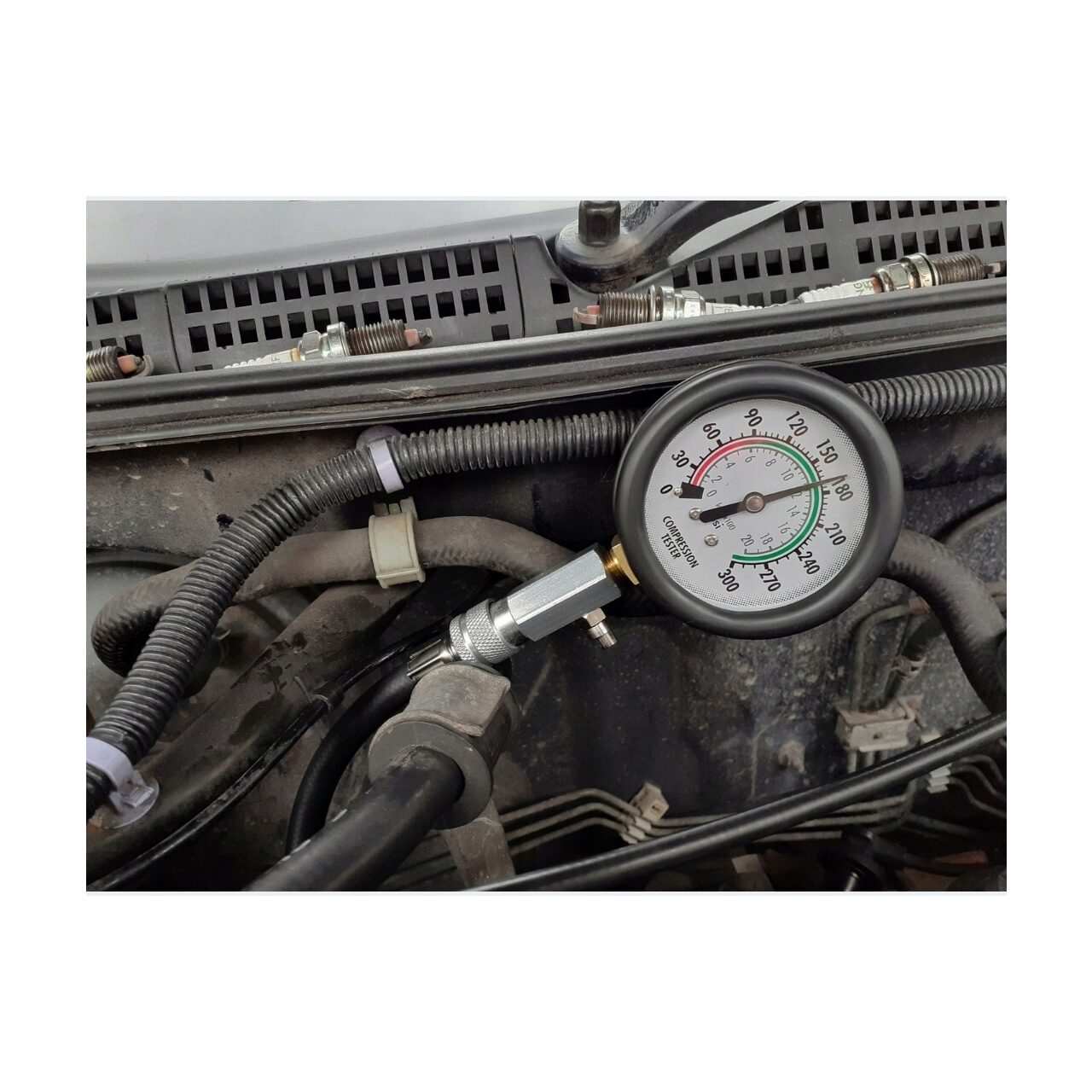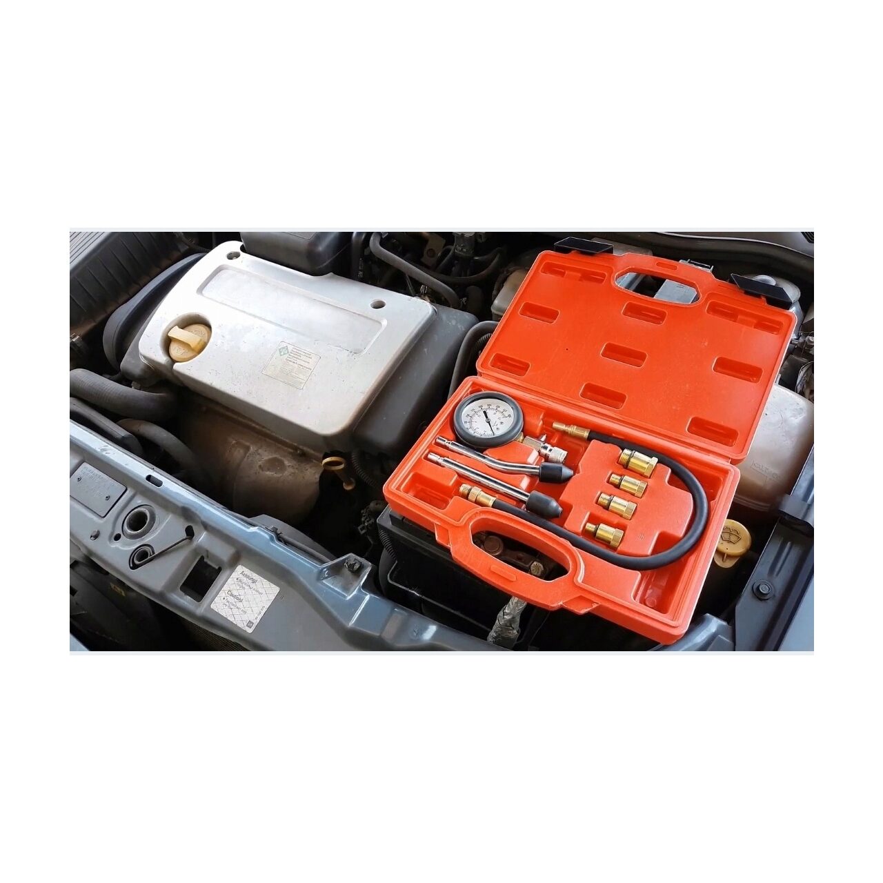 Tester pentru verificarea presiunii de compresie în cilindrii motorului pe benzină cu accesorii care îi extind capacitățile. Carcasa din plastic include un manometru cu supapă, o extensie dreaptă și îndoită, o prelungire a furtunului de presiune și 4 adaptoare pentru conectarea la cilindri. Piesele sunt echipate cu cuplaje rapide pentru o instalare usoara si rapida.