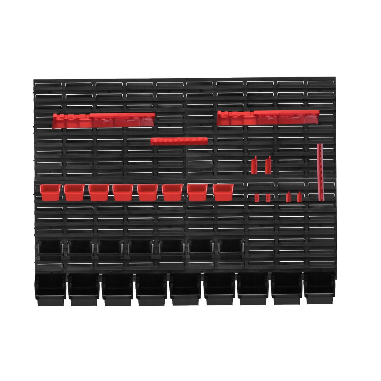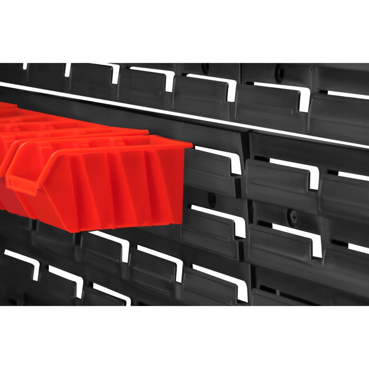 Setul include patru plăci de suport robuste și 76 de accesorii , inclusiv recipiente de diferite dimensiuni, suporturi pentru șurubelnițe și chei, tăvi și cârlige.