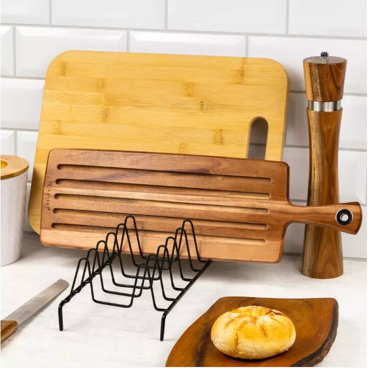 Proiectat pentru a ține și stivui capace, plăci de tocat, tigăi de mică adâncime și chiar ziare sau cărți de rețete.