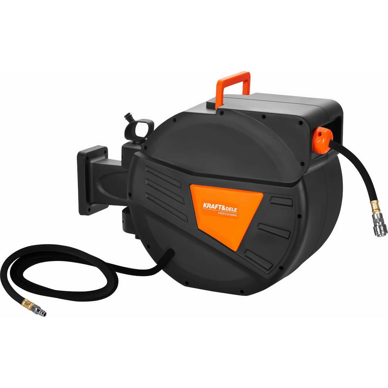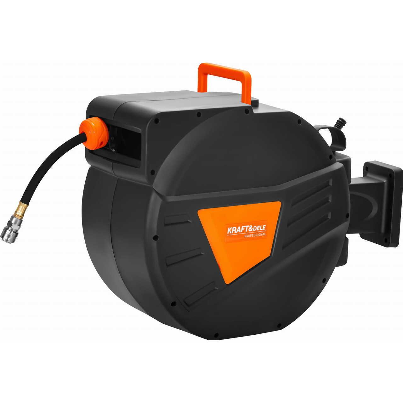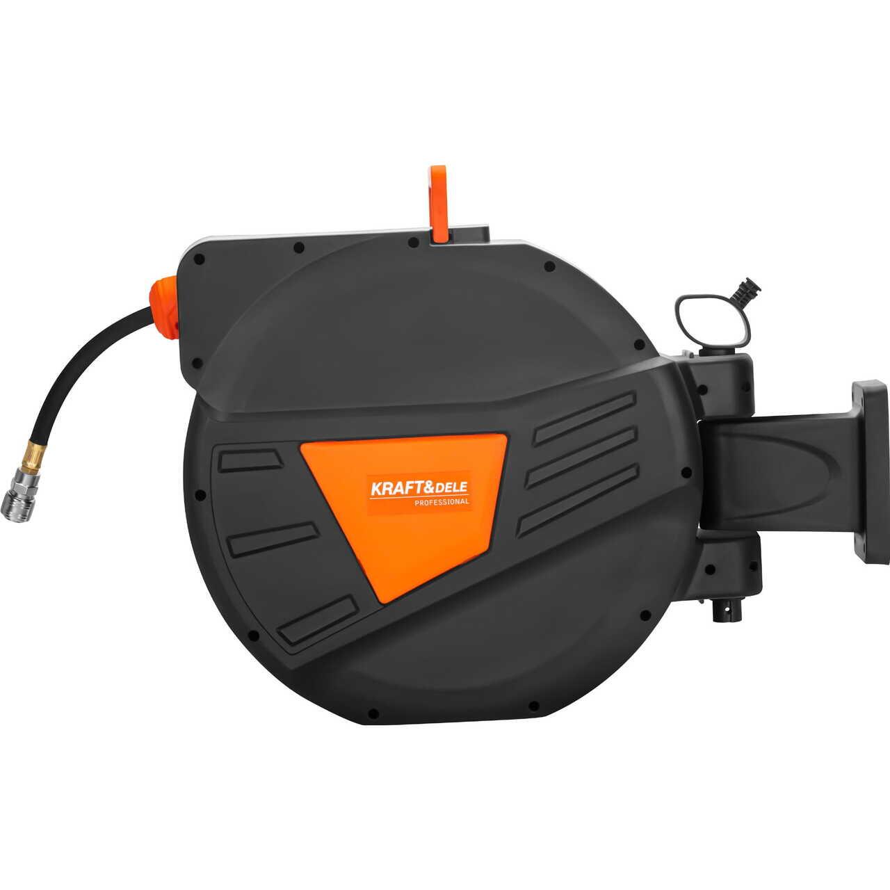 Este un furtun pneumatic KRAFTDELE practic de 30 m + 2 m, montat pe o rolă automată, conceput pentru utilizare cu aer comprimat.
