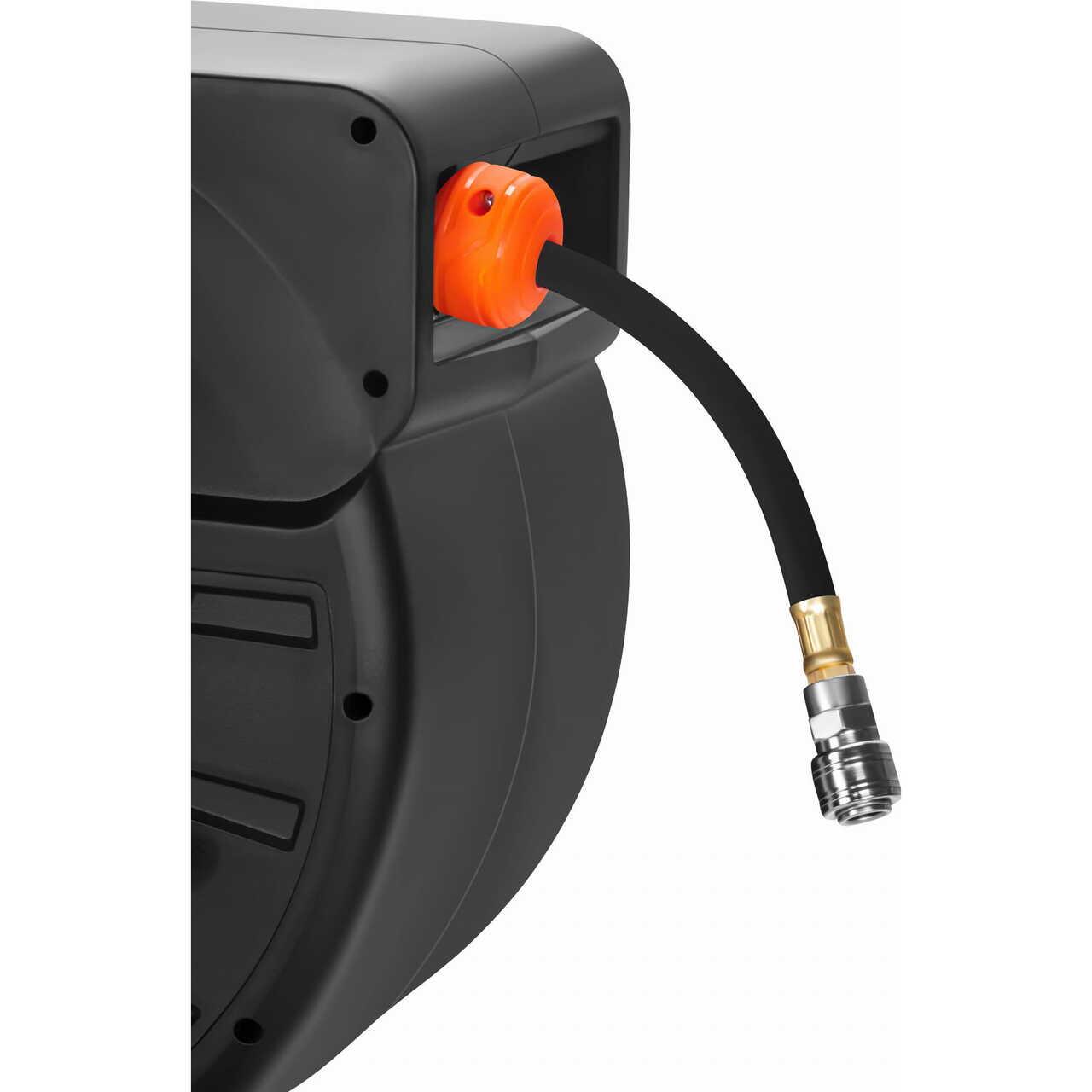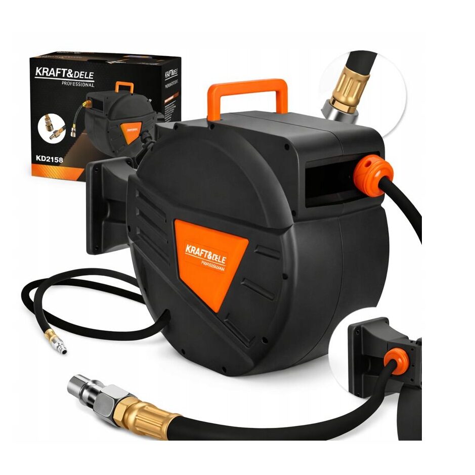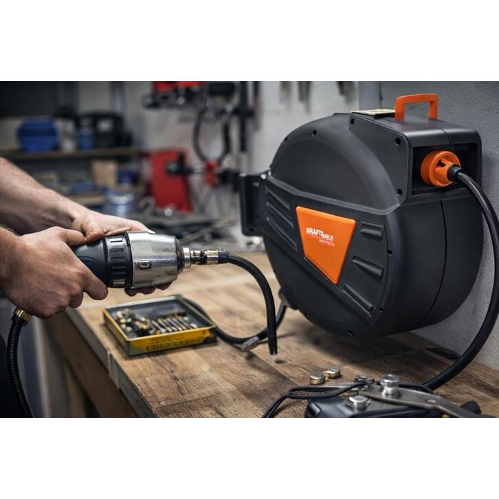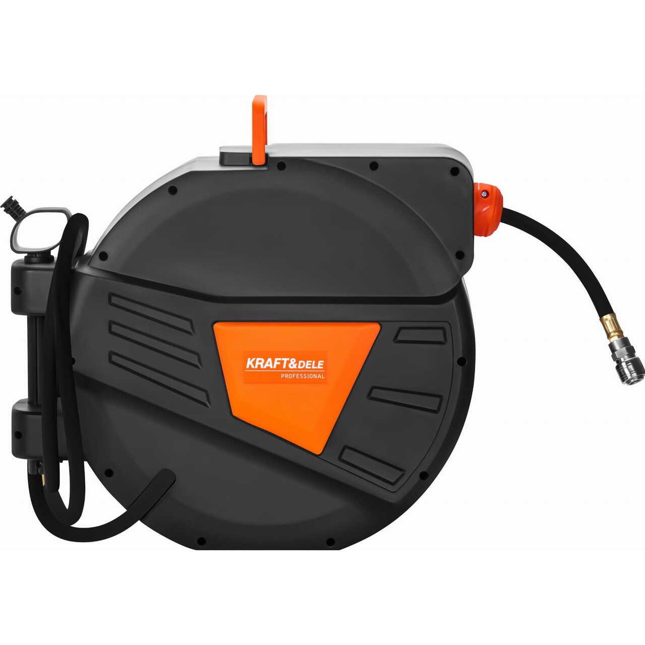 Este un furtun pneumatic KRAFTDELE practic de 30 m + 2 m, montat pe o rolă automată, conceput pentru utilizare cu aer comprimat.