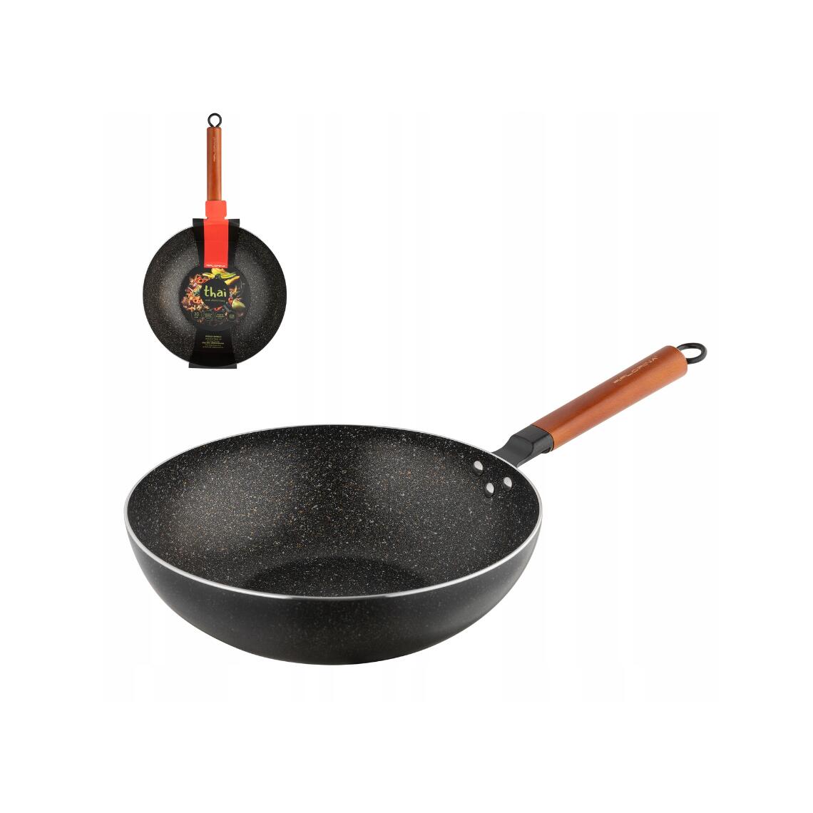 Tigaie thailandeză din aluminiu extrudat de înaltă calitate. Este durabil și rezistent la zgârieturi. Tava este acoperită cu un strat antiaderent de tip piatră. Se poate prăji sănătos, într-o cantitate mică de grăsime. Tigaia este rezistenta la temperaturi ridicate. Manerul din lemn ofera o prindere puternica, fara teama de arsuri. Un wok negru va ieși în evidență printre alte tigăi. Se recomandă spălarea cu mana