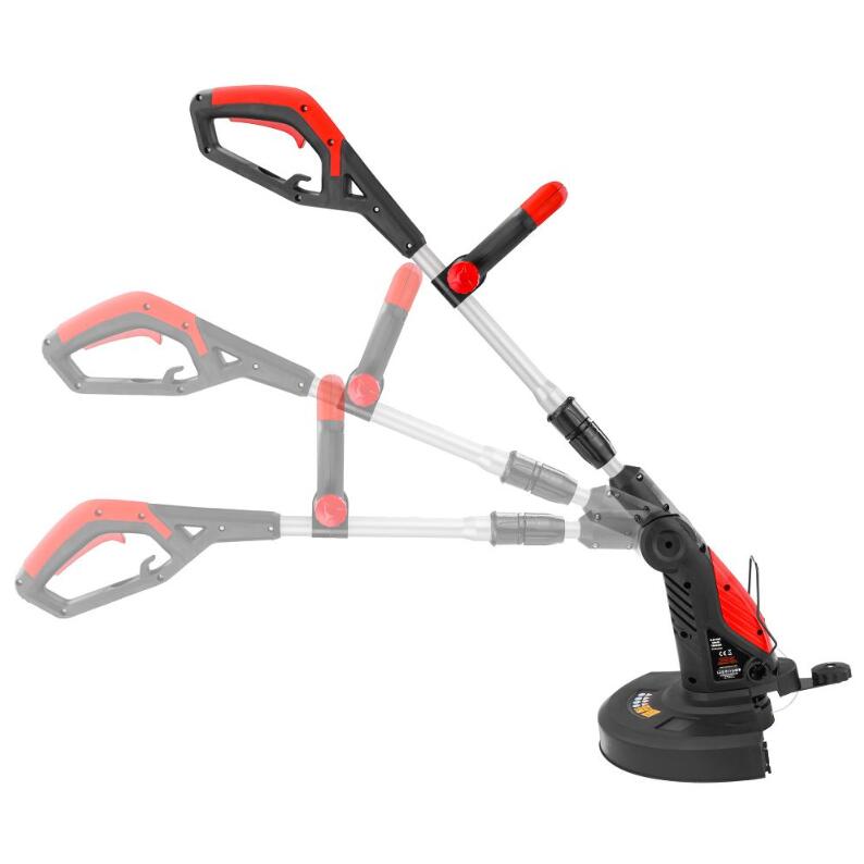 Pe langa reglarea manerului, trimmerul electric are si functia de a roti intregul maner fata de cap cu motorul.Dupa apasarea butonului , puteti seta unghiul in cinci pozitii cu un unghi maxim de 80 de grade.Trimmerul poate fi folosit in siguranta langa pereti datorita protectiei sistemului de taiere.Un avantaj suplimentar este sistemul de inlocuire rapida a firului.