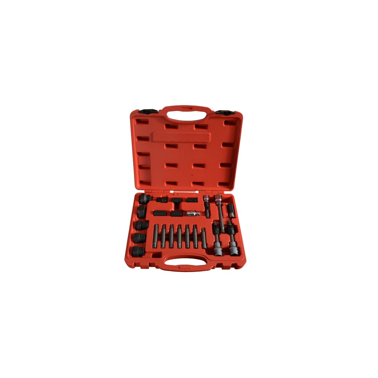 Un set de 24 de chei pentru asamblarea si dezasamblarea alternatoarelor. Adaptat la mașini ale următoarelor mărci: Audi, BMW, Fiat, Ford, Mercedes, Opel, Porsche, Renault, Peugeot, Seat, Skoda, Volvo, VW și altele. Cheile vă permit să deșurubați simultan șurubul de montare al scripetei (folosind bitul corespunzător) și să țineți scripetele cu ambreiajul (folosind o priză specializată).
