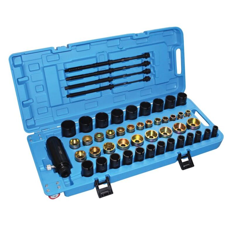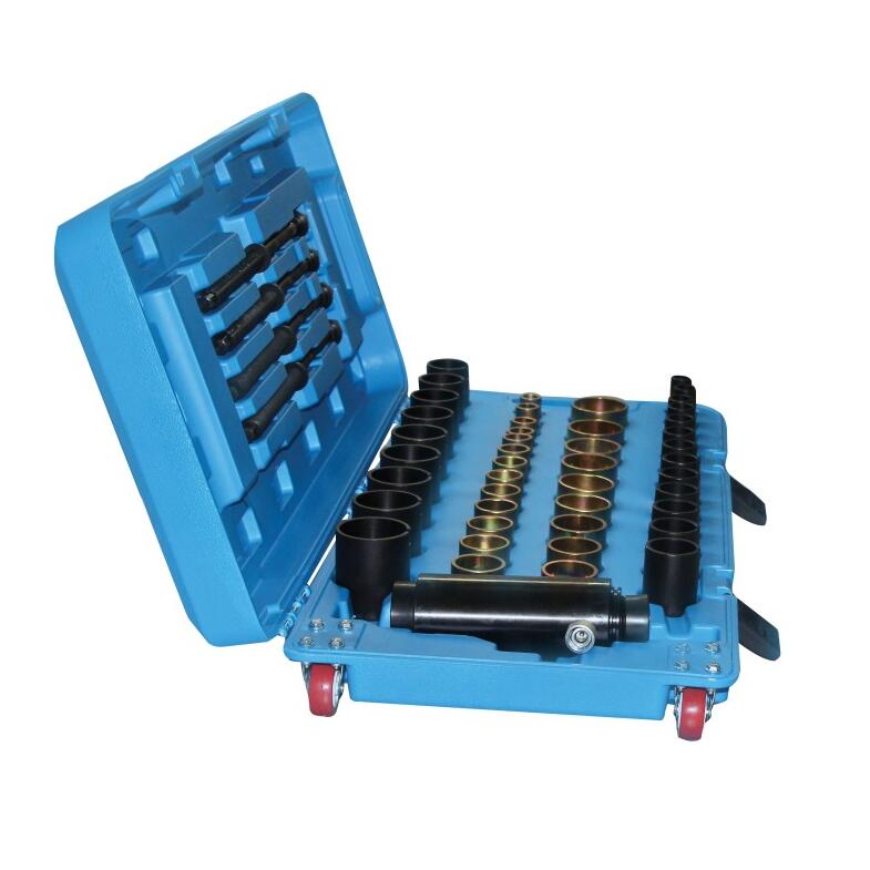 Un set conceput pentru demontarea/instalarea bucșelor din cauciuc-metal, a rulmenților, a pivoților și a butucilor la autoturisme și autoutilitare.