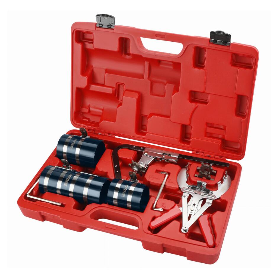 TREI INTERVALURI DE LUCRU – FUNCȚIONALITATE COMPLETĂ Setul include trei adaptoare de lucru adaptate la diferite diametre ale segmenților: – 50–125 mm / 75 mm – 60–175 mm / 100 mm – 60–175 mm / 150 mm Datorită acestui fapt, un singur dispozitiv vă permite să reparați o gamă largă de pistoane și cilindri.