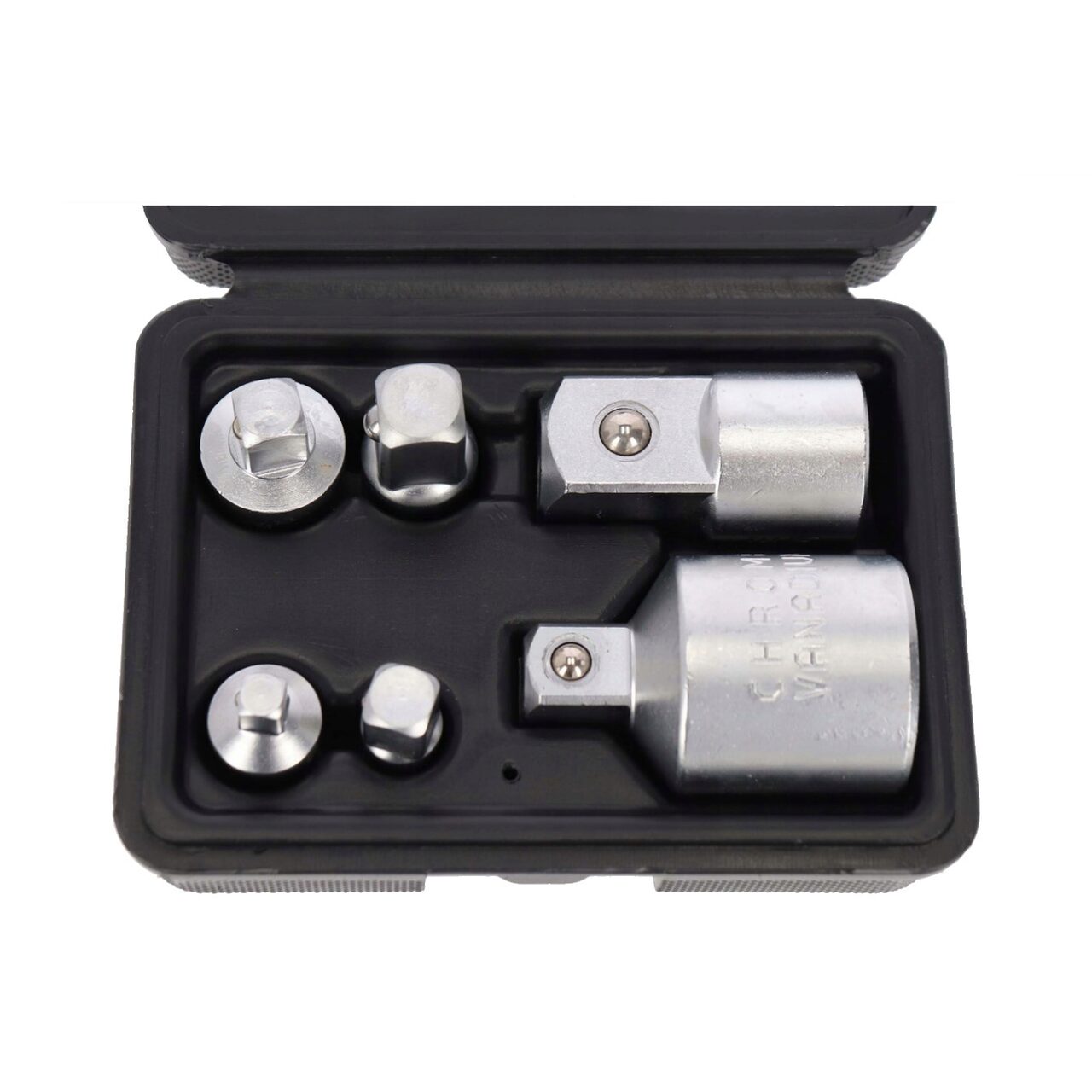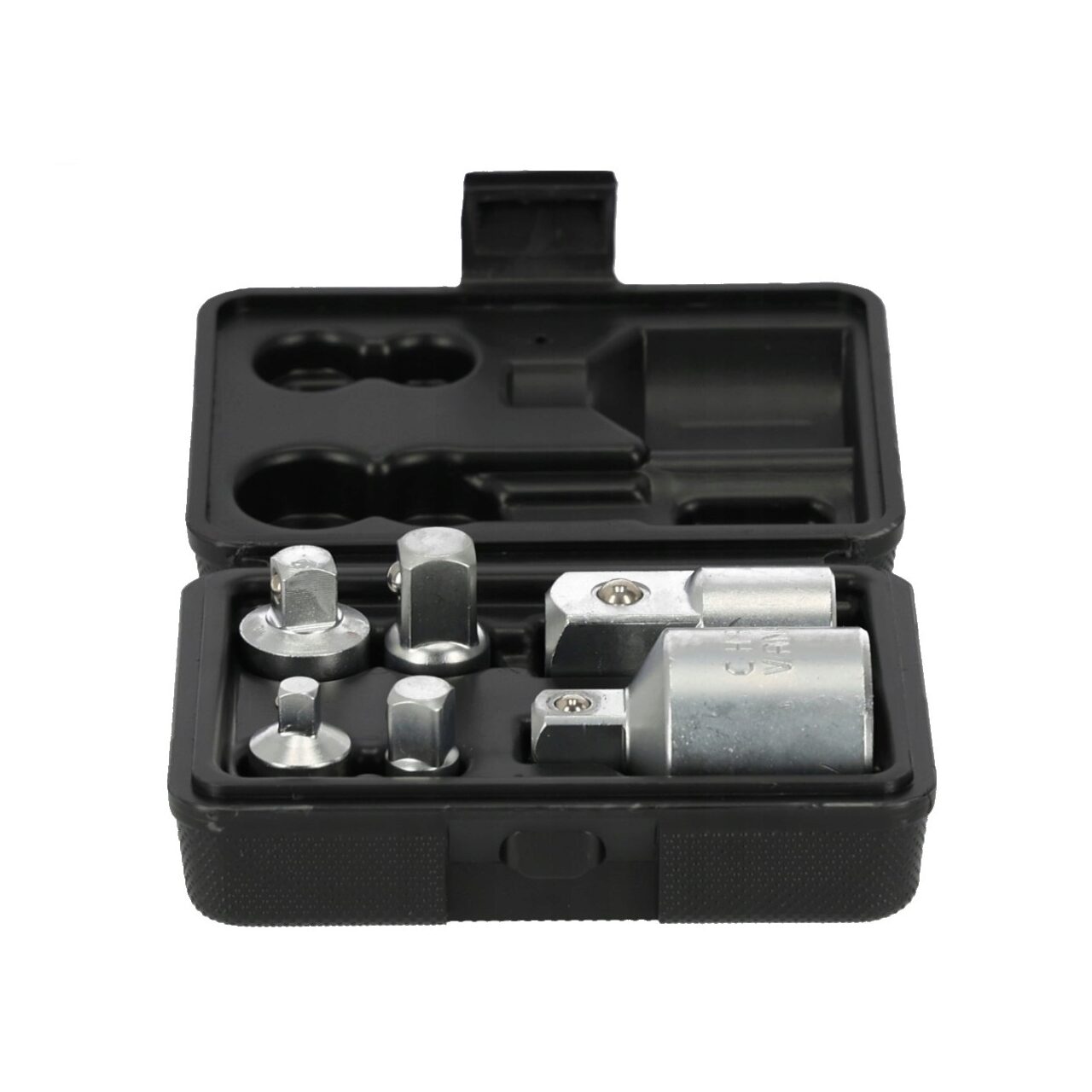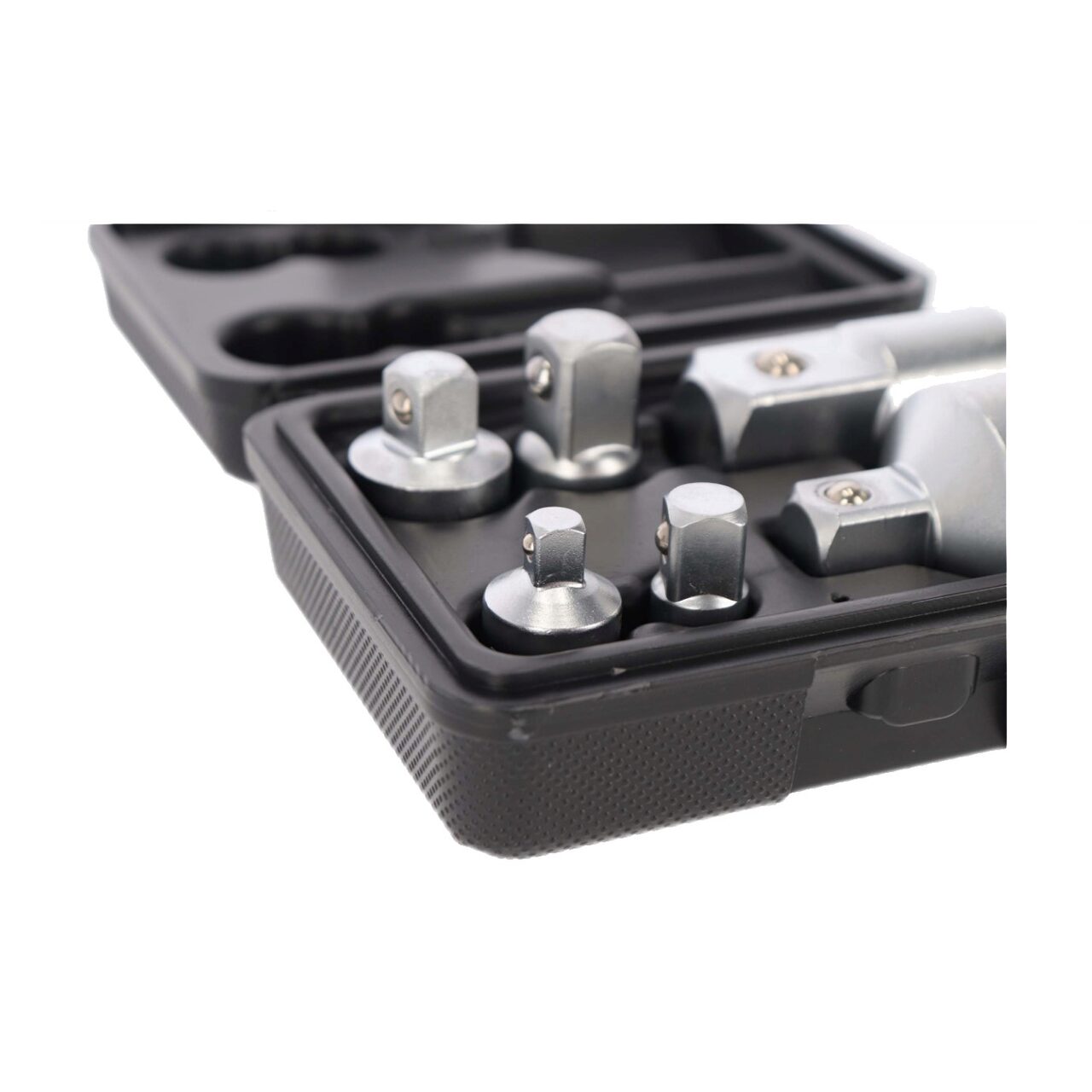 Un set de adaptoare pentru chei tubulare în dimensiunile 1/4", 1/2", 3/8" și 3/4" din oțel crom-vanadiu durabil (CrV).