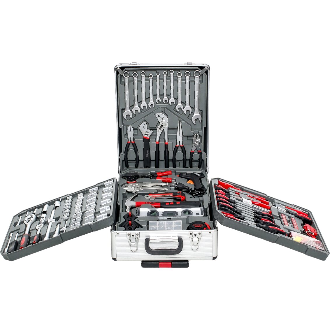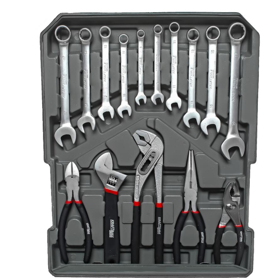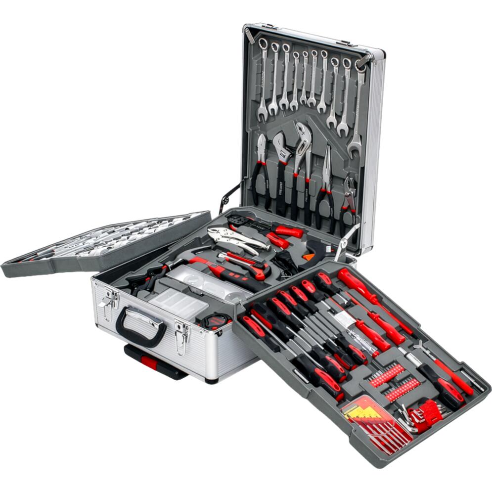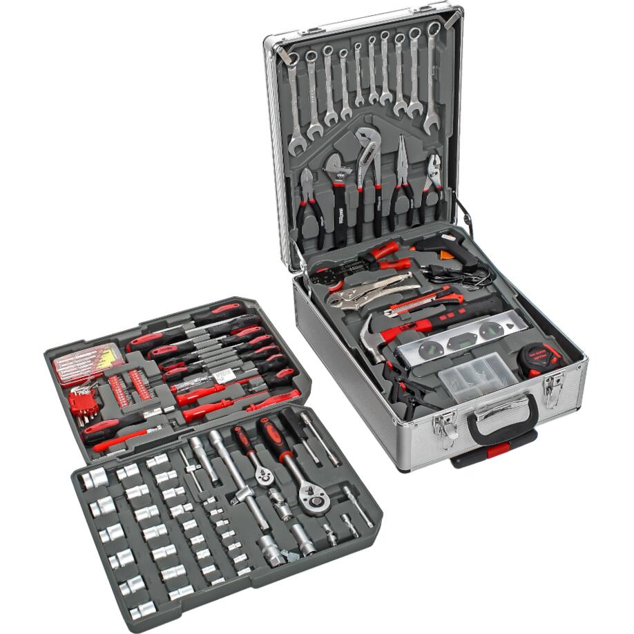 Setul include o gamă largă de scule manuale esențiale pentru atelierele auto, atelierele de reparații și companiile producătoare. Casetele detașabile permit organizarea convenabilă, accesul rapid la scule și transportul facil al articolelor selectate. Un set complet de chei, tubulare, clești, șurubelnițe și accesorii permite finalizarea majorității lucrărilor fără a fi nevoie de scule suplimentare.