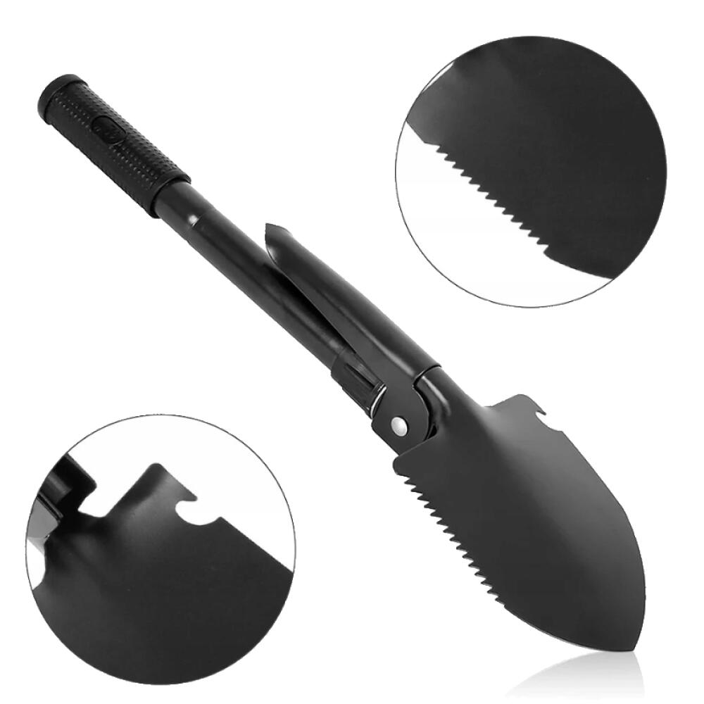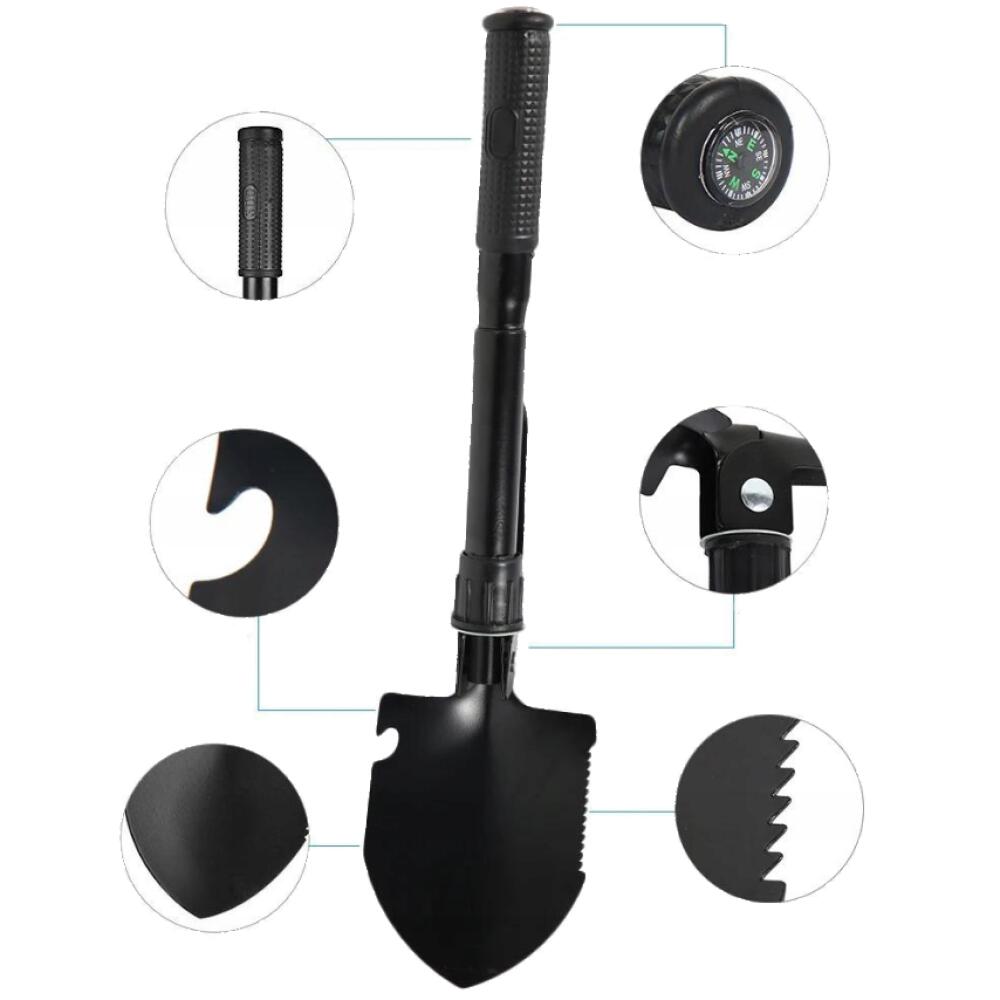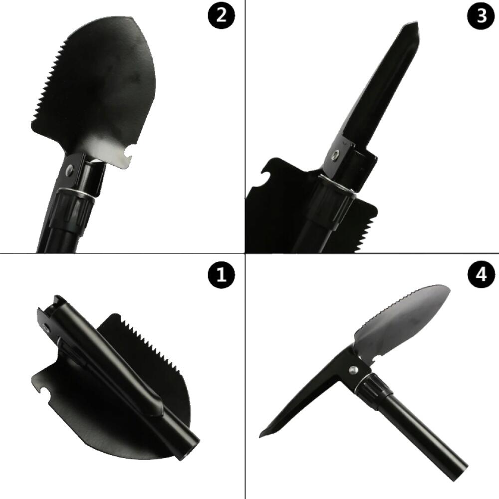 Unealta 4 în 1 este un dispozitiv multifuncțional care este perfect pentru camping, excursii de mai multe zile cu prietenii și de asemenea, acasă. Multe funcții într-un singur instrument: spatulă, târnăcop, fierăstrău, deschizător. Datorită elementelor pliabile, este compact și ușor de transportat. Mânerul din cauciuc face ca lopata să se potrivească bine și în siguranță în mână.