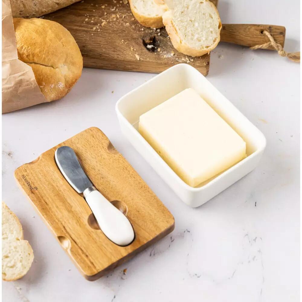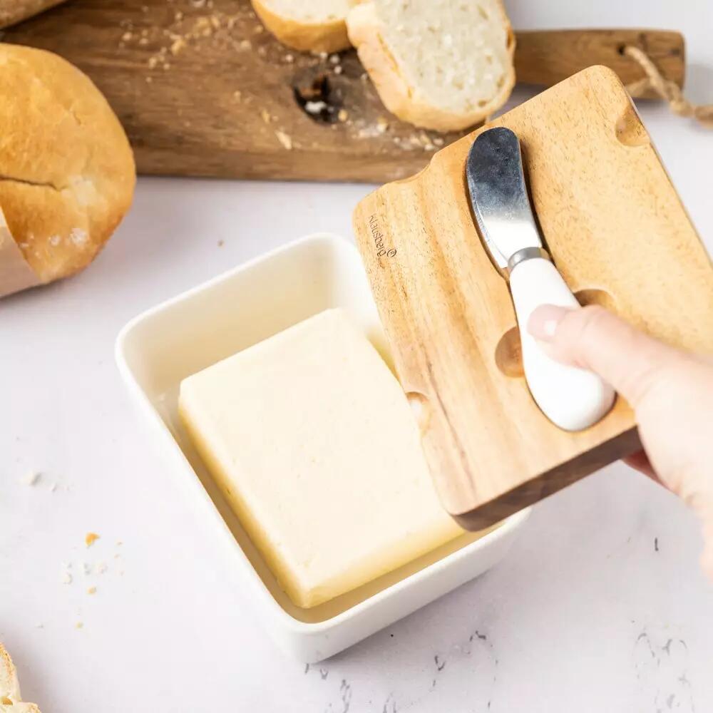 - Capacul din lemn de salcâm prelungește prospețimea untului sau a brânzei.