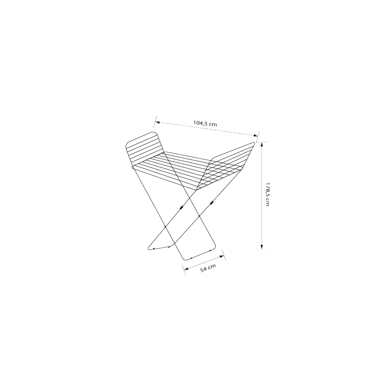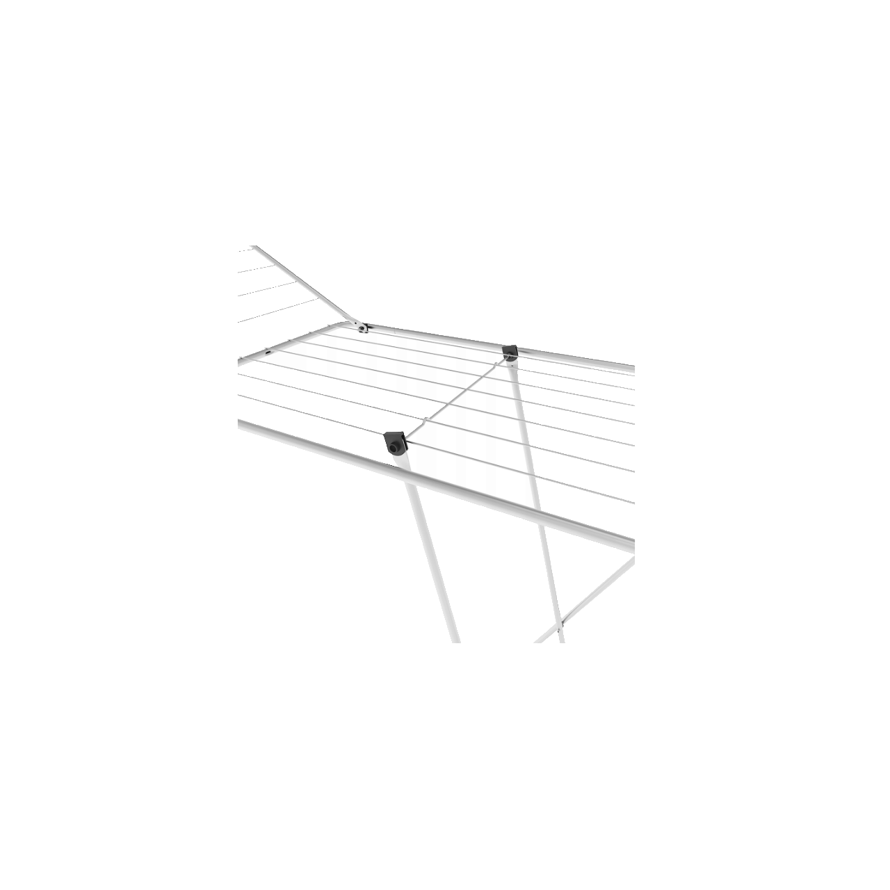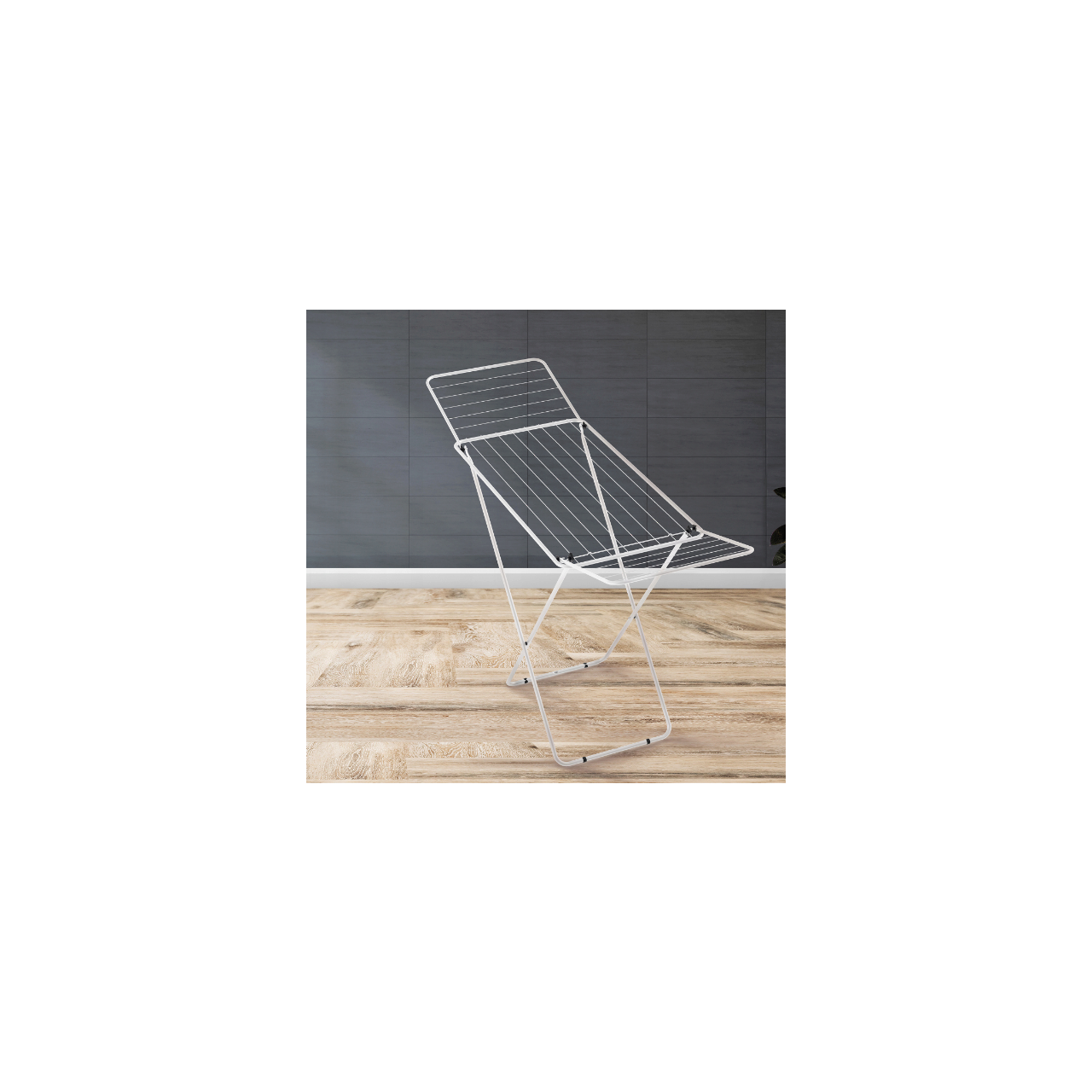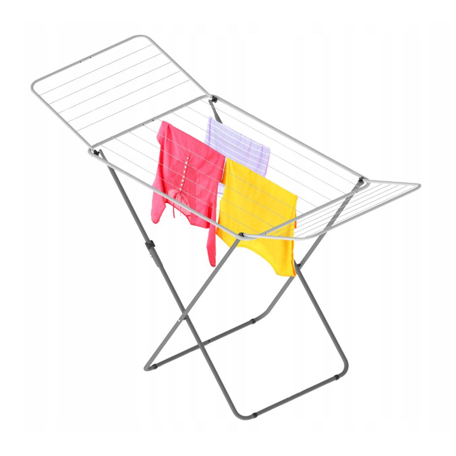 Uscătorul este realizat din oțel vopsit cu pulbere în alb și argintiu. Are suporturile rabatabile și picioare încrucișate.