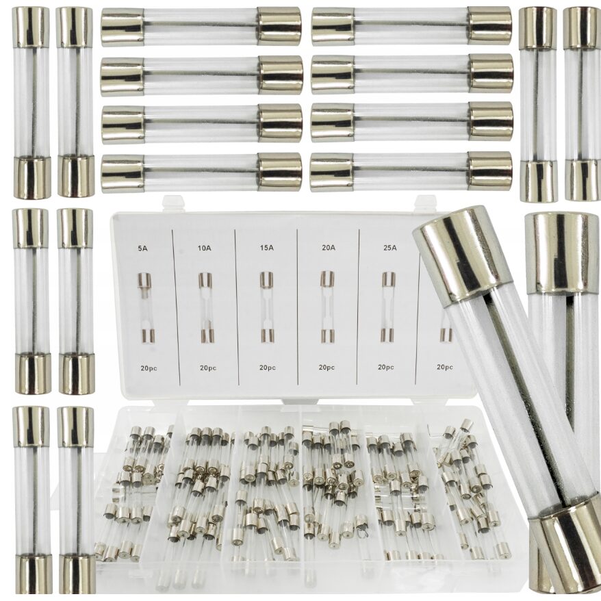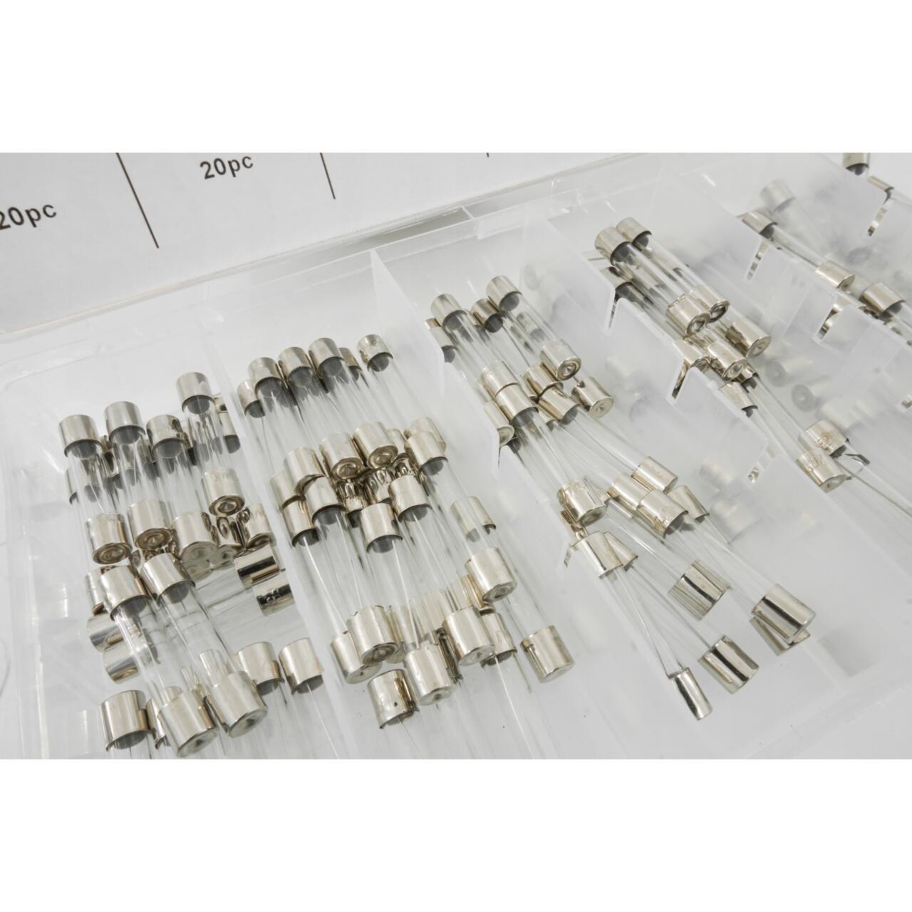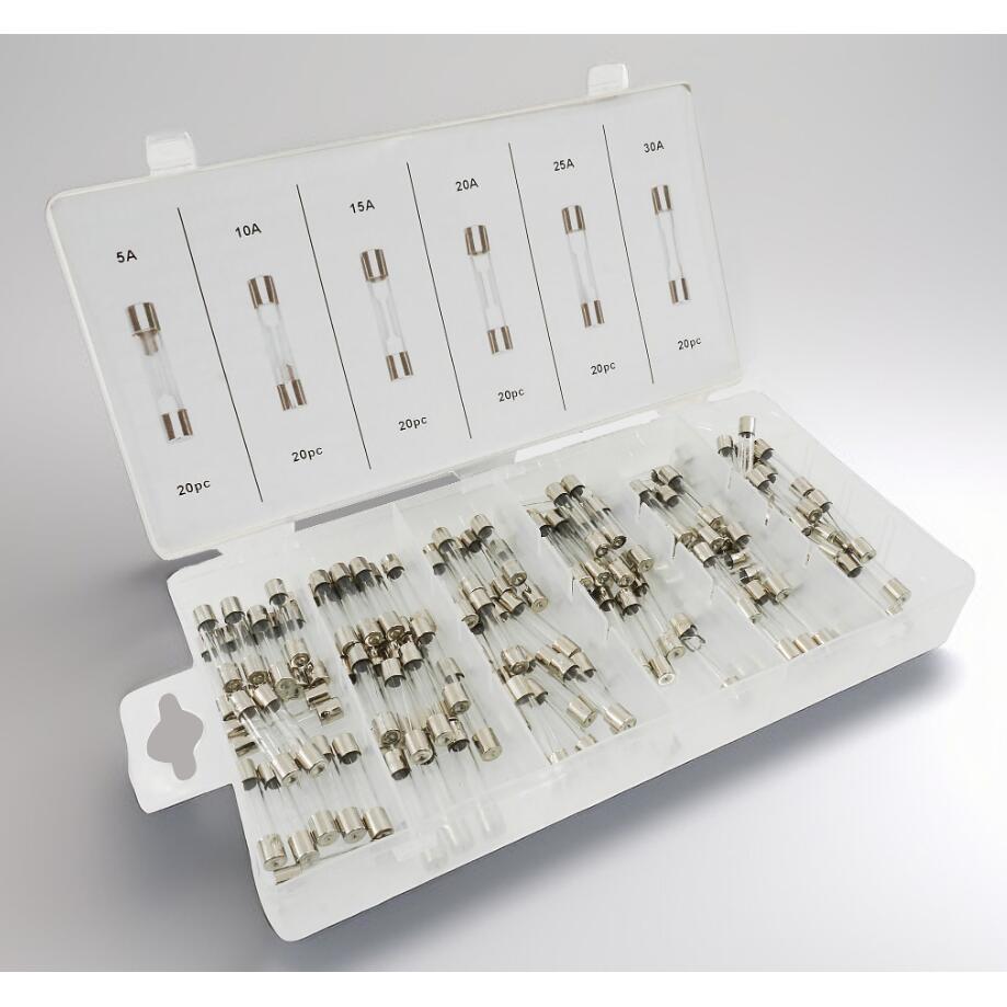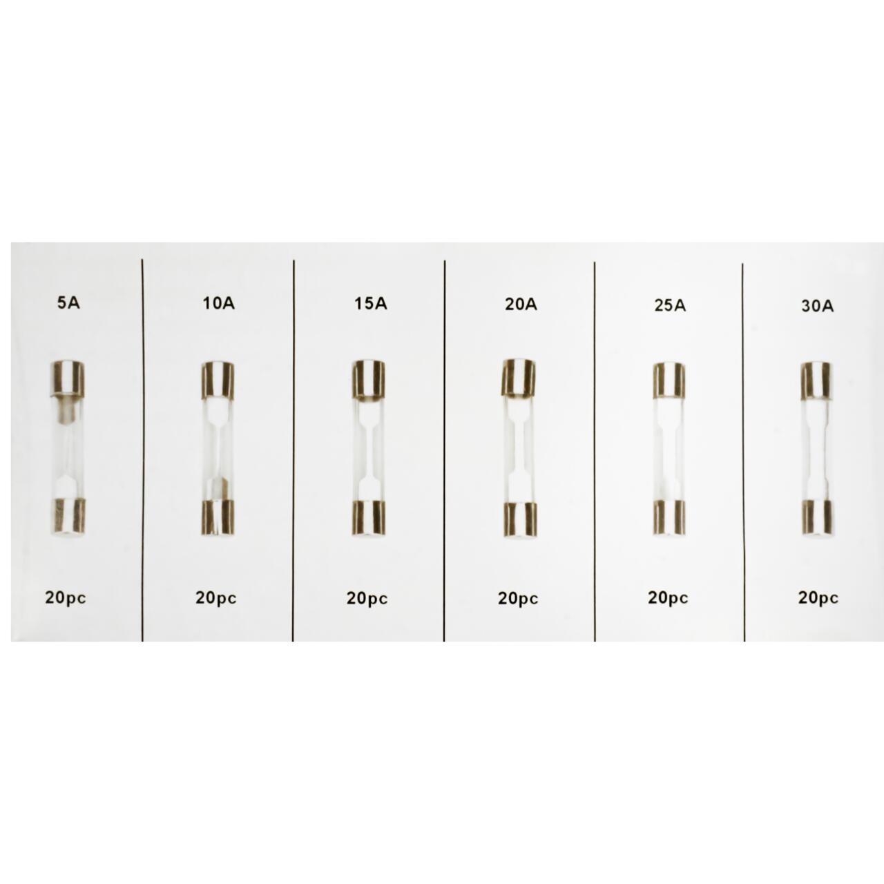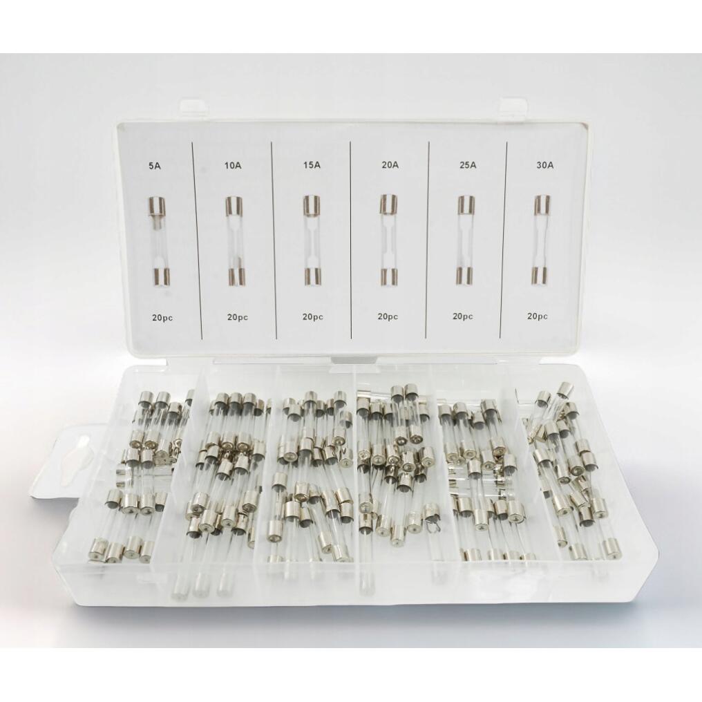 Set de sigurante din sticla. Setul contine 120 de elemente: 5A, 10A, 15A, 20A, 25A, 30A, cate 20 de piese fiecare.