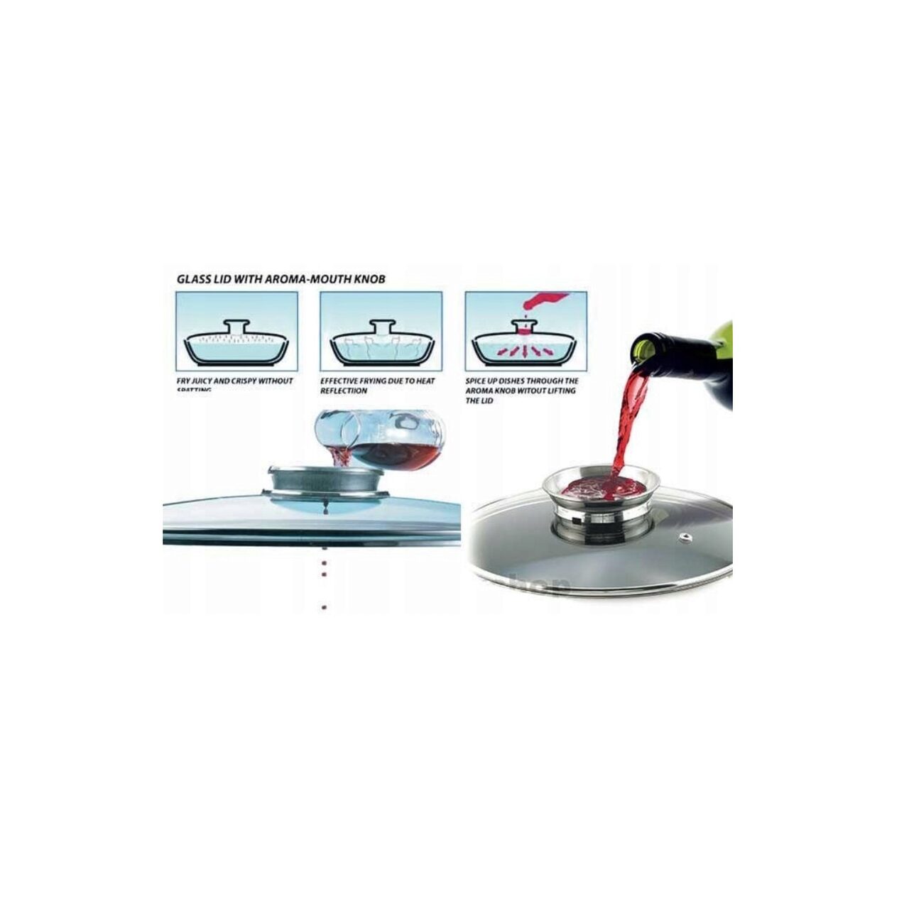Capac din sticlă călită cu un orificiu și un Buton pentru aromă pentru distribuirea condimentelor lichide în timpul gătitului.